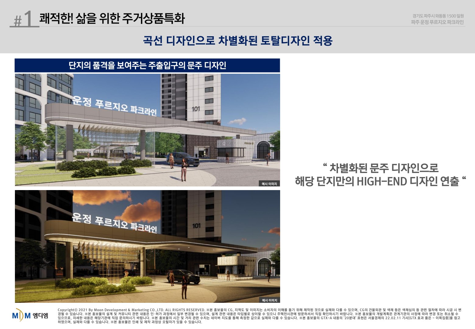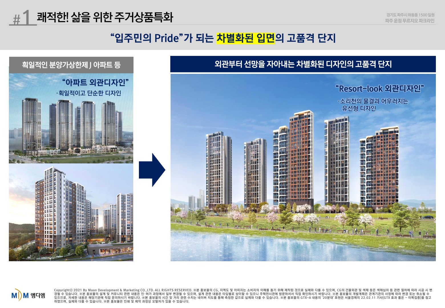 입주민의 프라이드 Pride 가 되는 차별화된 입면의 고품격 단지 운정 푸르지오 파크라인 입니다.