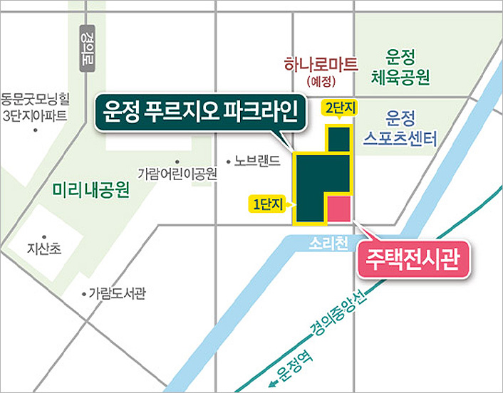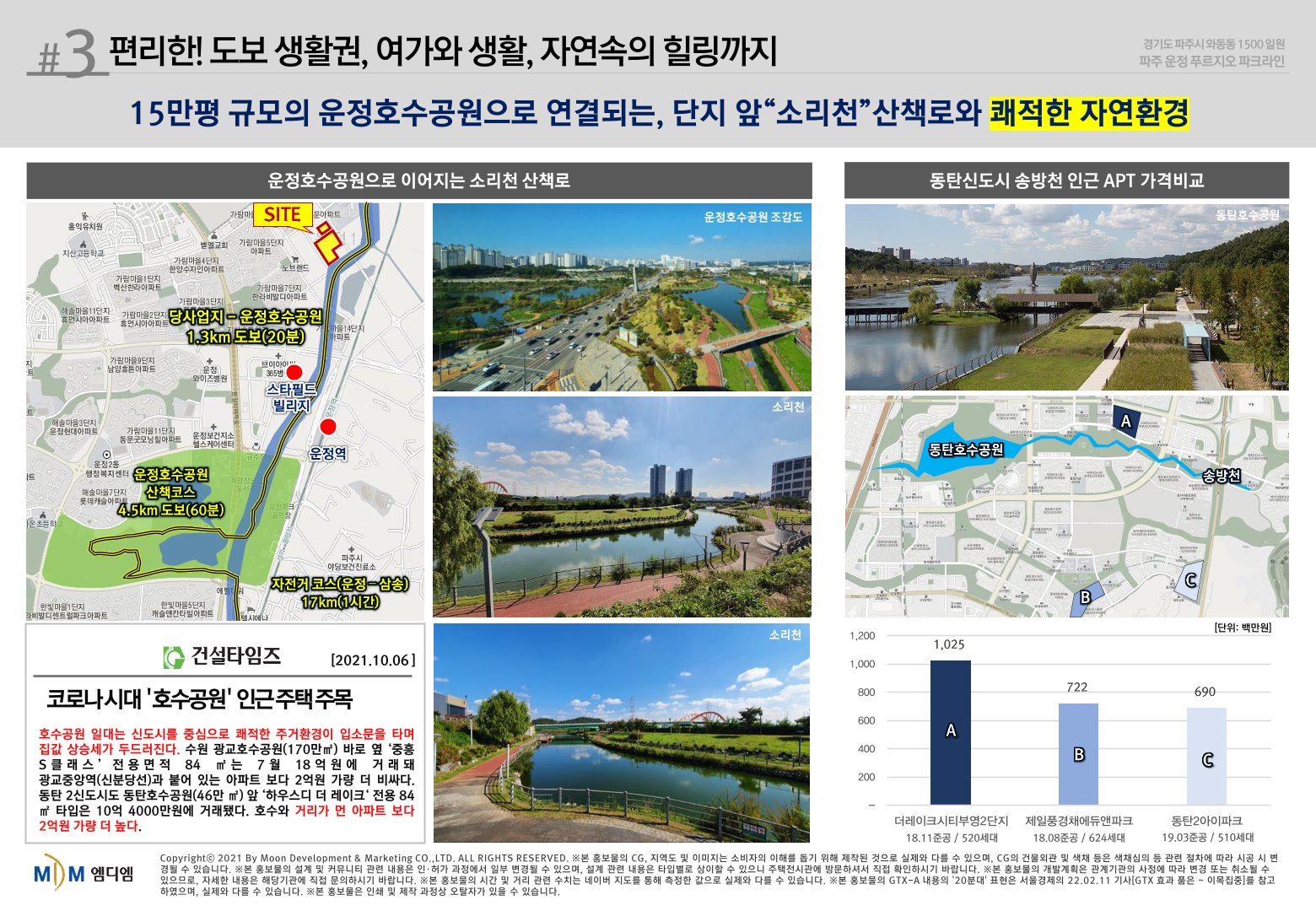 15만평 규모의 운정호수공원으로 연결되는, 단지 앞 소리천 산책로와 쾌적한 자연환경을 누리실 수 있습니다.
