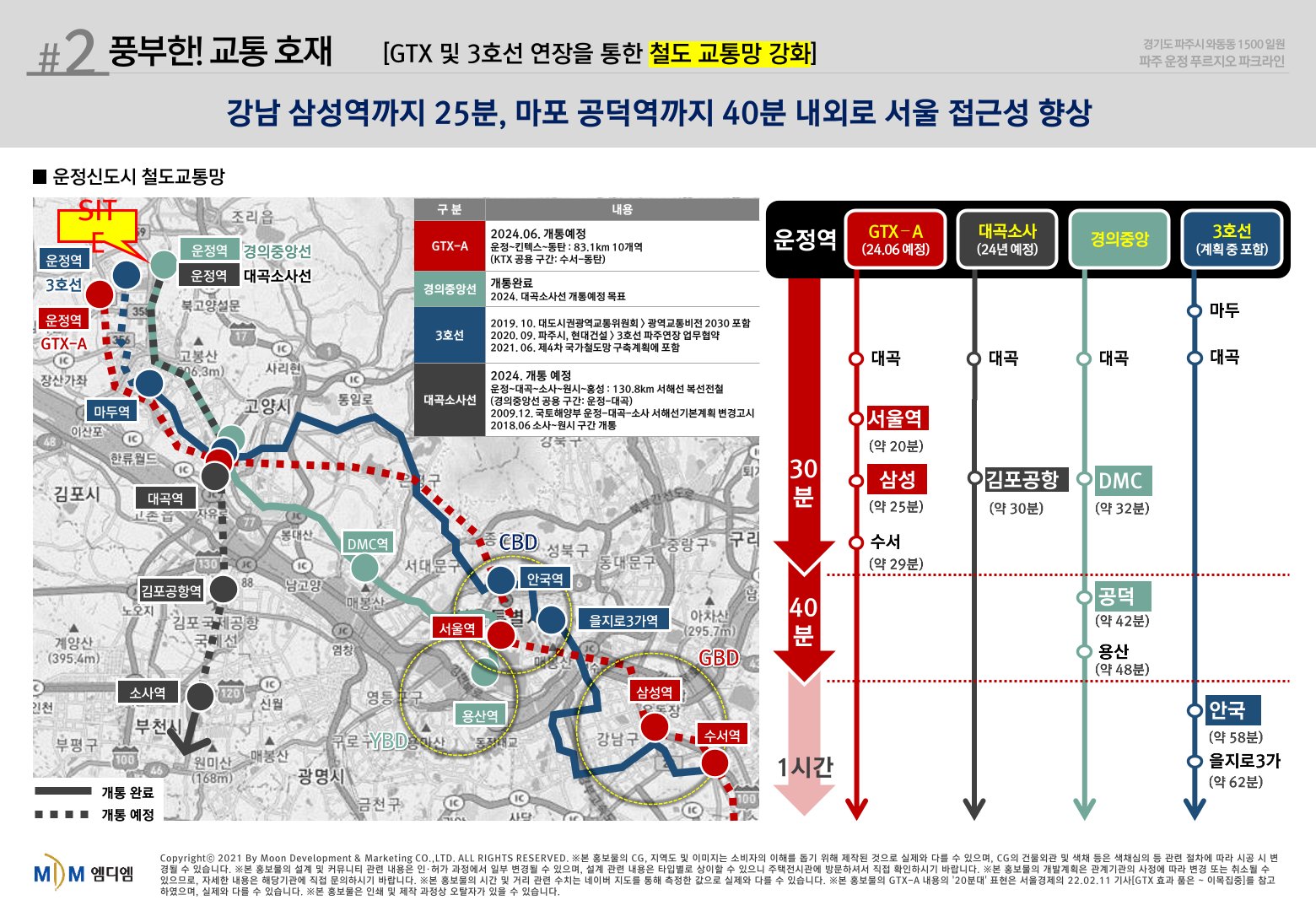 강남 삼성역까지 25분, 마포 공덕역까지 40분 내외로 서울 접근성이 향상되었습니다.