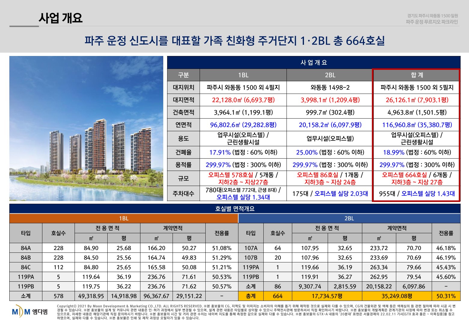 운정 푸르지오 파크라인은 2개 단지, 총 664실 규모로 이루어져 있습니다.